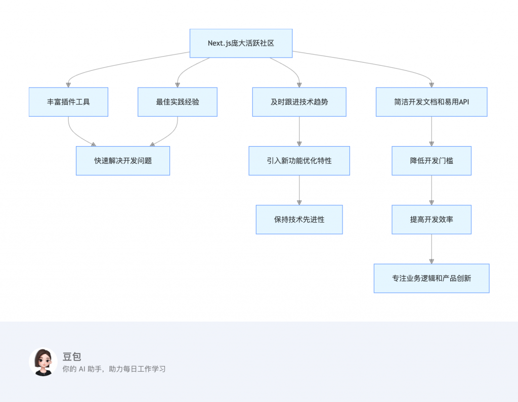 Next.js 拥有庞大且活跃的社区,这为 AI 知识库平台的开发和维护带来诸多便利。开发团队可以从社区获取丰富的插件、工具和最佳实践经验,快速解决开发过程中遇到的问题。同时,社区的持续更新和改进也使得 Next.js 能够及时跟进最新的前端技术趋势,平台可以借助这些优势不断引入新的功能和优化现有特性,保持技术先进性,为用户提供更优质的服务。其简洁清晰的开发文档和易用的 API 接口,降低了开发门槛,提高了开发效率,使得团队能够更专注于业务逻辑的实现和产品功能的创新。